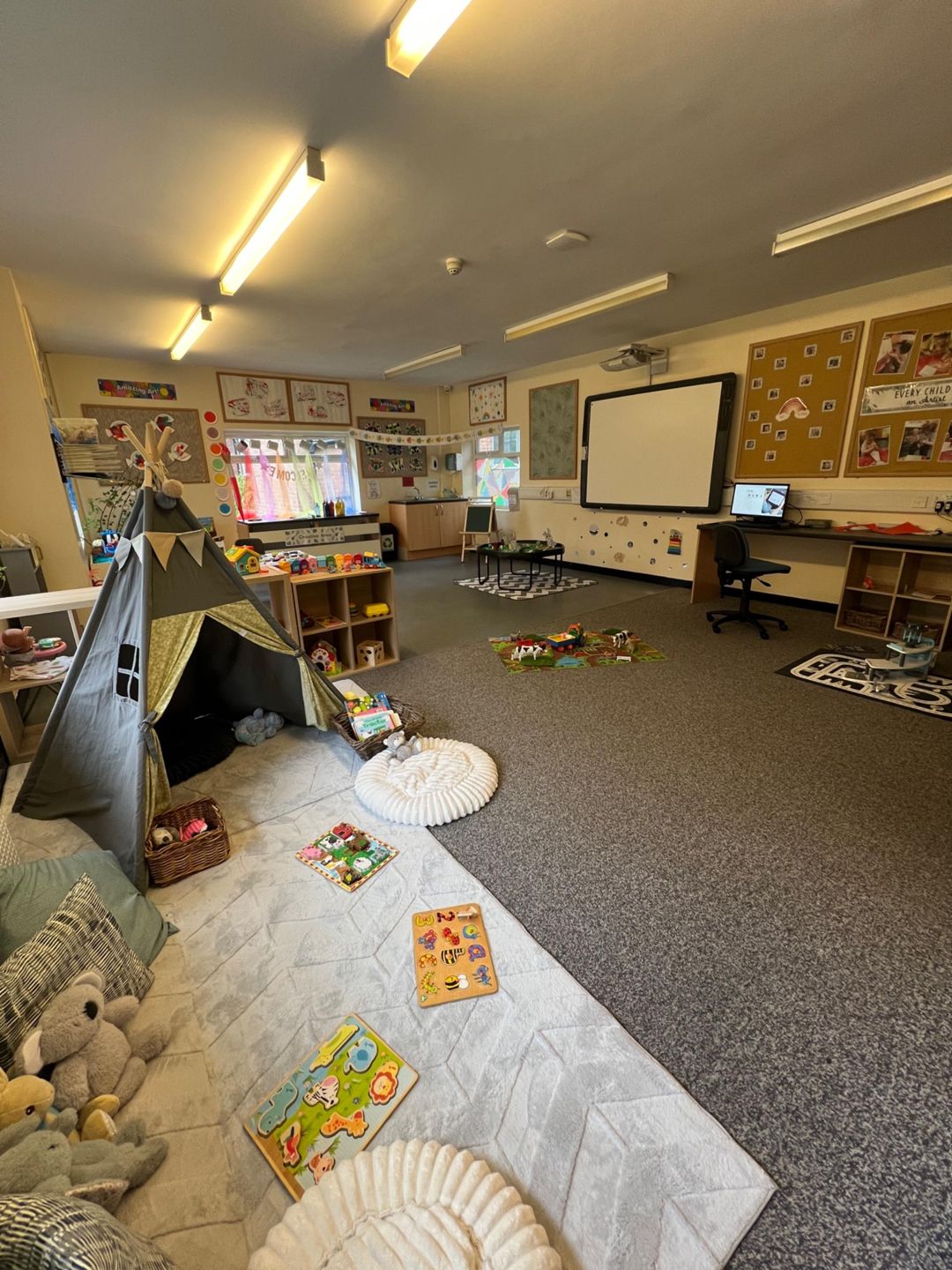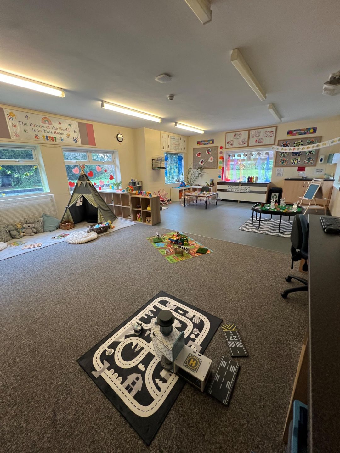 o large playrooms at the front of the building. This room is designed to be a home from home where the youngest children can be nurtured in cosy spaces and learn to explore the bigger spaces whether crawling, shuffling or taking their first steps. There are lots of floor level activities as well as those placed a little higher to encourage children to pull themselves up, to stand and to walk. There is a soft play corner for practising those all important climbing and balancing skills, opportunities for mark making, a cosy book corner, an inviting home corner and lots of toys to encourage investigation.